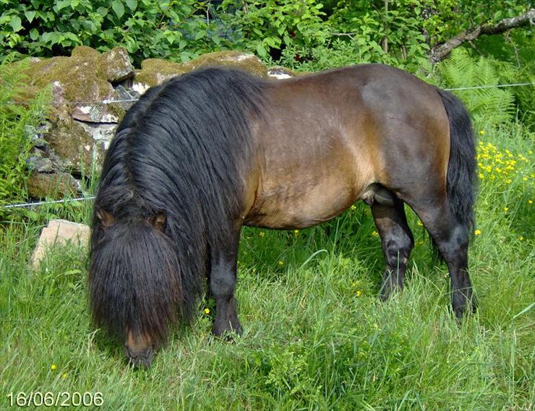 Elvira (shetlandsponny -95) ville jag köpa hösten 1996 men då var hon inte tillsalu. Hon var efter en av mina favorithingstar Highball of Marswood. I stället blev Maria fodervärd åt henne men fick senare köpa henne efter några år. Hon stod hos oss i Hällingsjö två somrar då hon inte klarade av Marias bete och fick fång. Hon fick avlivas pga hovbensförsänkning mm. Hon stod hos mig då och jag var med. bild 2005